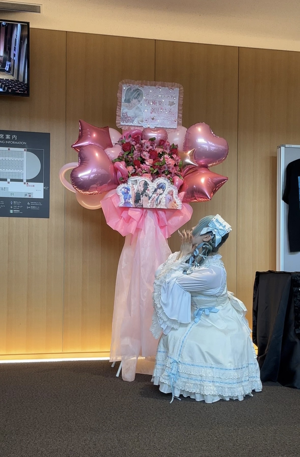 本番当日、楽屋でバタバタと準備に追われていたら知乃さんに「やること何も終わってないと思うんだけど、ロビーきて!」って結構緊急事態的な感じで呼び出されて、受付スタッフの打ち合わせかなぁと呑気に考えながら小走りでロビーに向かったら、メンカラのピンク色の大きなフラスタが飾られてて。