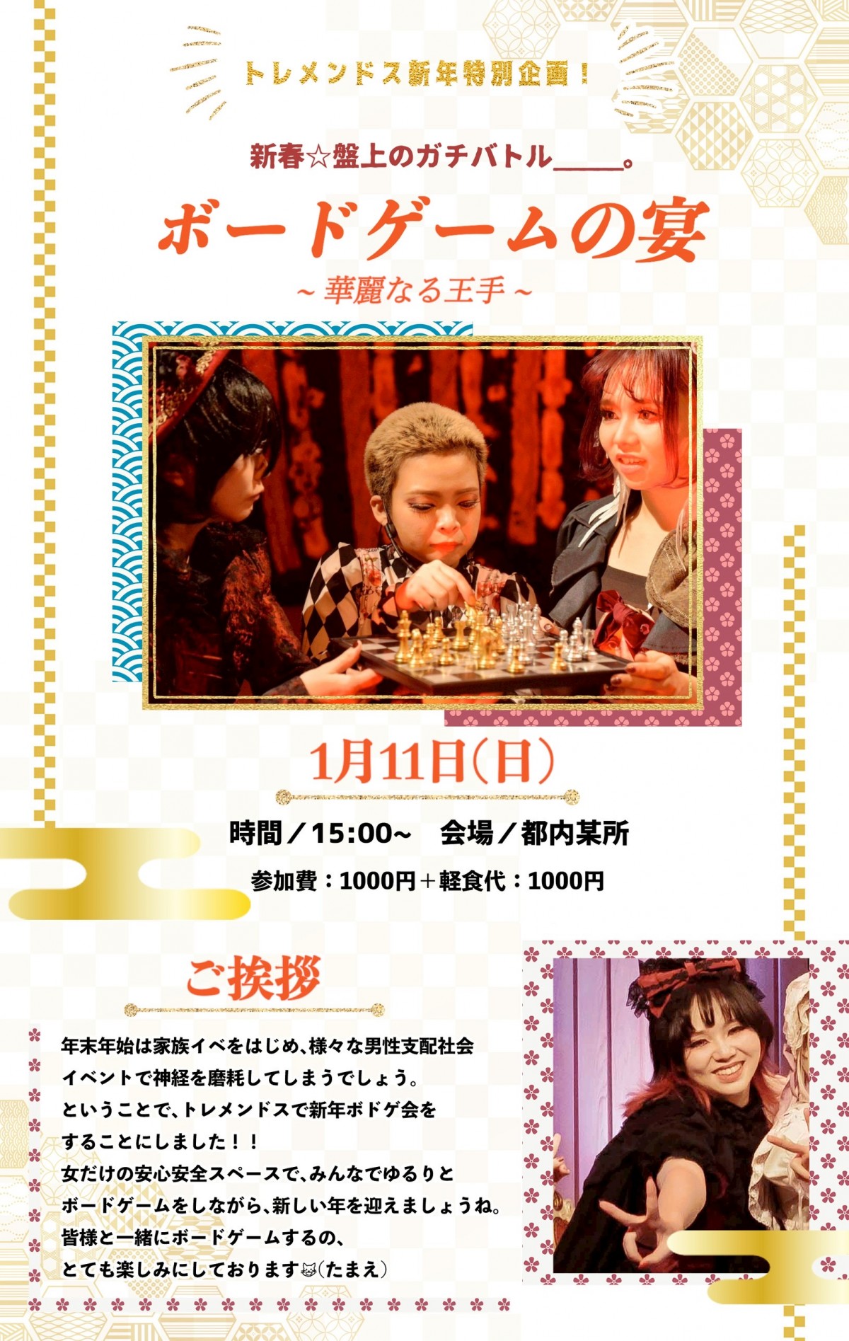 女だけの安心安全スペースで、みんなでゆるりとボードゲームをしながら、新しい年を迎えましょうね。皆様と一緒にボードゲームするの、とても楽しみにしております😺(たまえ)」